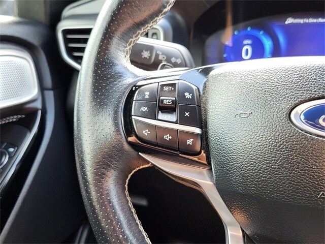 This vehicle contains the following features and options: Equipment Group 401A, Ford Co-Pilot360 Assist+ (Evasive Steering Assist, Intelligent Adaptive Cruise Control, Speed Sign Recognition, and Voice-Activated Touchscreen Navigation System), ST High Package (110V/150W AC Power Outlet, 360-Degree Camera w/Split View, Auto-Dimming Rearview Mirror (Interior), Front Parking Sensors, Front Rain-Sensing Wipers, Memory Driver's Seat, Power Tilt/Telescoping Steering Column, Radio: B&O Sound System by Bang & Olufsen, Reverse Brake Assist, Second Row Heated Seats, Sideview Mirrors w/Gloss Black Caps, Third Row PowerFold (Folds Flat), Universal Garage Door Opener (UGDO), and Wireless Charging Pad), ST Street Pack (Performance Front & Rear Brakes and Wheels: 21" Aluminum), Technology Package (10.1" LCD Capacitive Portrait Touchscreen and 2 Additional Speakers), Twin Panel Moonroof, 20" Machined Aluminum w/Painted Pockets Wheels, 3.58 Non-Limited-Slip Rear Axle Ratio, 3rd row seats: bench, 4-Wheel Disc Brakes, 4G LTE Wi-Fi Hotspot Credit, 6 Speakers, ABS brakes, Air Conditioning, Alloy wheels, AM/FM radio: SiriusXM, AM/FM Stereo, Auto High-beam Headlights, Automatic temperature control, Brake assist, Bumpers: body-color, Compass, Delay-off headlights, Driver door bin, Driver vanity mirror, Dual front impact airbags, Dual front side impact airbags, Electronic Stability Control, Emergency communication system: SYNC 3 911 Assist, Exterior Parking Camera Rear, FordPass Connect, Four wheel independent suspension, Front anti-roll bar, Front Bucket Seats, Front Center Armrest, Front dual zone A/C, Front fog lights, Front reading lights, Fully automatic headlights, Heated door mirrors, Heated front seats, Heated steering wheel, Illuminated entry, Knee airbag, Leather Htd/Ventilated Sport Captain's Chairs, Leather steering wheel, Low tire pressure warning, Memory seat, Occupant sensing airbag, Outside temperature display, Overhead airbag, Overhead console, Panic alarm, Passenger door bin, Passenger vanity mirror, Power door mirrors, Power driver seat, Power Liftgate, Power passenger seat, Power steering, Power windows, Rear air conditioning, Rear anti-roll bar, Rear reading lights, Rear window defroster, Rear window wiper, Remote keyless entry, Security system, SelectShift Capability w/Paddle Shifters, Speed control, Speed-sensing steering, Speed-Sensitive Wipers,